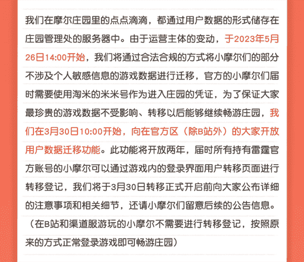合作结束本就是开发方和代理方双方的事情,,,降低这件事情对玩家的影响,,才是对所有珍视这段童年的摩尔玩家最好的呵护。。。目前看来,,用户完全不用担心后续因无法登录游戏而造成任何数据上的损失,,只要及时进行账号转移,,,就可以好好保留、、延续在庄园的痕迹和回忆,,,继续在庄园里做快乐的红鼻子小鼹鼠。。