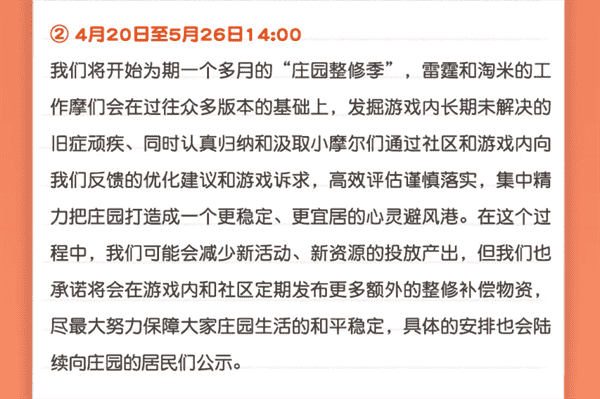 合作的结束并不意味着这个童年IP的结束,,对于《摩尔庄园》手游而言,,这是一个新阶段的开始。。。。后续游戏内将开启庄园重构计划,,,会就以往遗留下来的BUG进行集中修复,,,,并在游戏内和社区定期发布更多补偿物资。。