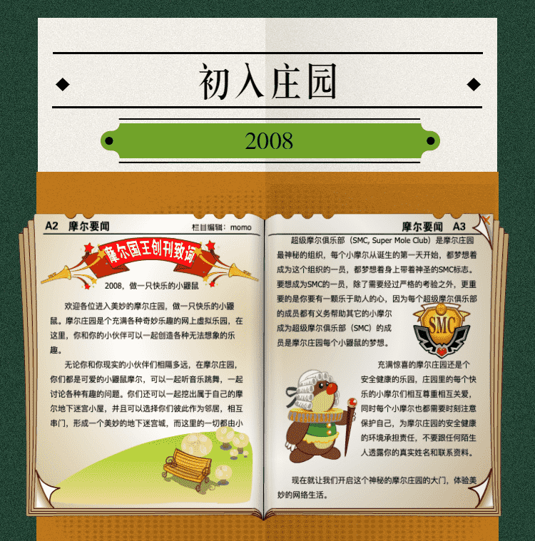 在这一年,,摩尔庄园诞生了。。在这里,,,,大家都是可爱的红鼻子鼹鼠小摩尔,,,,可以一起勤劳耕作,,一起高山滑雪......我们都是摩尔庄园的建设者。。。。